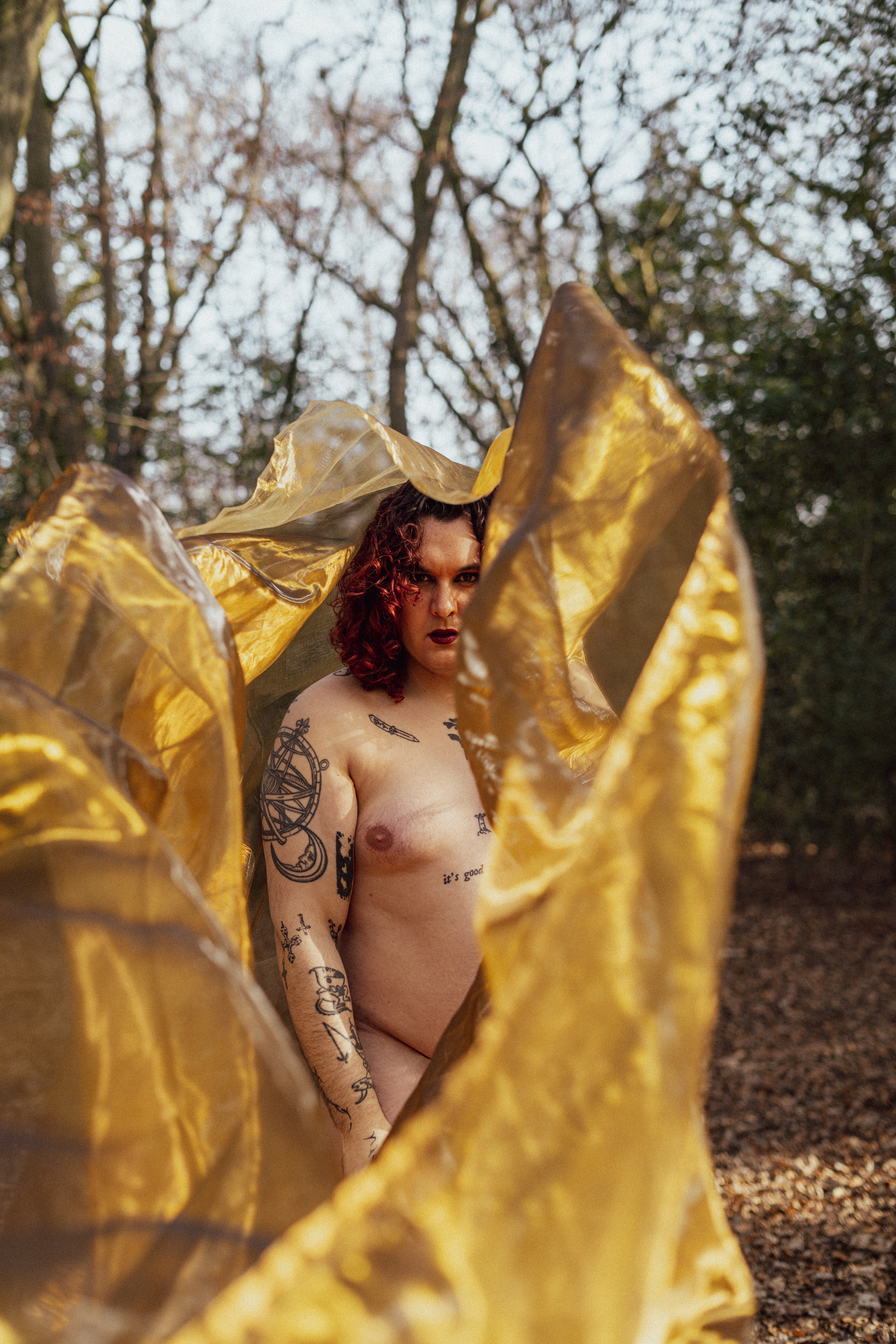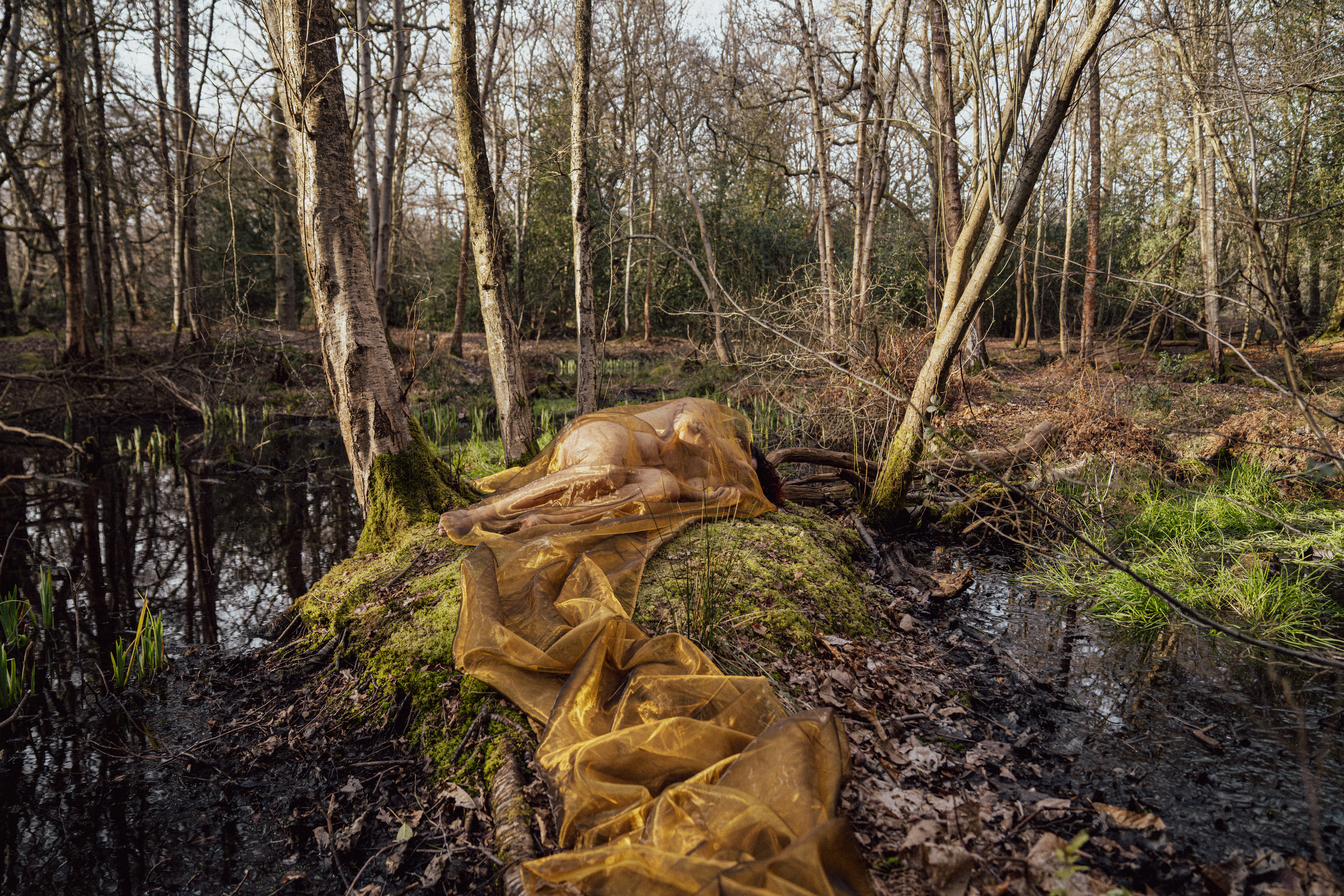 gold organza fabric flows between the model and the forest, acting as a shield and a costume, both controlled and endured. the power dynamics are reflected by the elements of nature (moss, dead leaves, water and tall trees) which seem fragile yet all-encompassing. the sun rays decide where the movement appears, making every photograph a fixed point of an ever-changing landscape. the gilded appearance of the human-made material suggests an expensive and complex character, but it is subverted by its infinitely simple use and the desire to see it mingle with a “dirty” floor.